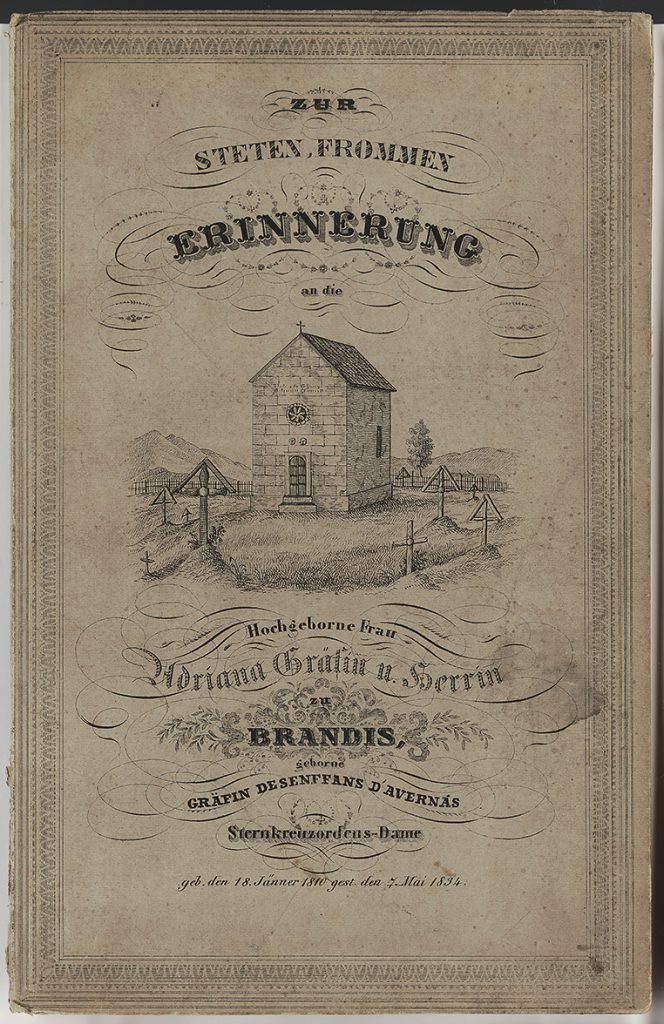 Zur steten, frommen Erinnerung an die Hochgeborene Frau Adriana Gräfin u. Herrin zu Brandis, geborene Gräfin de Senffans dʼAvenrás, Sternkreuzordens-Dame, geb. den 18. Jänner 1810, gest. den 7. Mai 1834 / V stalen, pobožen spomin na visokorodno gospo Adriano, grofico in gospodarico Brandis, rojeno grofico de Senffans dʼAvenrás, damo reda Zvezdnega križa, rojeno 18. januarja 1810, umrlo 7. maja 1834. Zunanja naslovnica: Unsere Unruhe und unsere Ruhe. Predigt gehalten bei der vom hochwürdigen Herrn Fürstbischofe von Seckau am 8. Juni 1837 vorgenommen feierlichen Einweihung der Begräbnis-Kapelle des Grafen Clemens von Brandis bei Marburg, von einem Priester der Werasammlung des heil. Erlösers. / Naš nemir in naš mir. Pridiga duhovnika Skupnosti Svetega odrešenika ob slovesni posvetitvi mrliške kapele grofa Clemensa Brandisa pri Mariboru 8. junija 1837; vodil jo je častitljivi knezoškof iz Seckaua. Notranja naslovnica: Wien/Dunaj, 1838. 21 strani, 20 cm, trda vezava; zunanja naslovnica