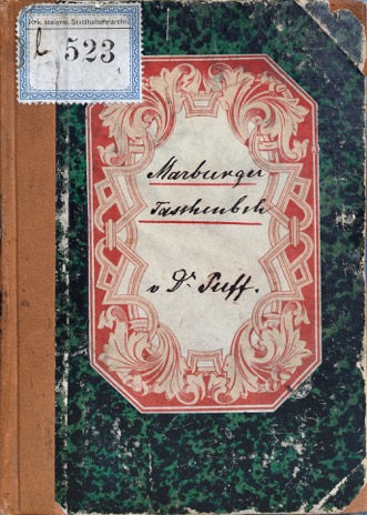 Marburger Taschenbuch für Geschichte, Landes- und Sagenkunde der Steiermark und der an die selbe grenzenden Länder von Dr. Rudolf Gustav Puff / Mariborska žepna knjiga za zgodovino, družbo in kulturo ter bajeslovje Štajerske in dežel, ki mejijo nanjo dr. Rudolfa Gustava Puffa. Graz/Gradec, 1853, 244 strani, 16 cm, trda vezava; zunanja naslovnica