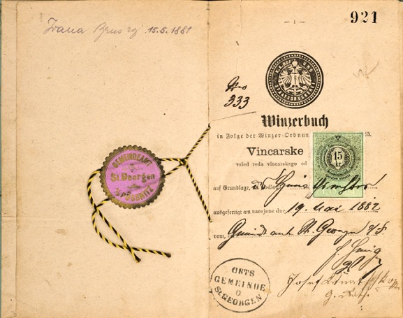 Winzerbuch – Vincarske bukve / Viničarska knjižica, izdana v krajevnem okrožju Sv. Jurij ob Pesnici 19. maja 1882. Pisana je bila na Jakoba Wrußa (Brus/Vrus) z Jurskega Vrha, ki ga je zaposlil Boštjan Magdič, duhovnik pri Sv. Juriju ob Pesnici v pokoju.