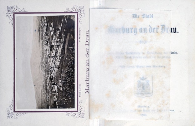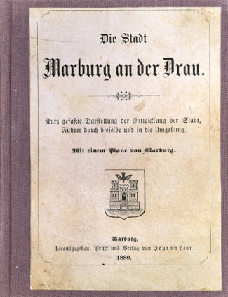 Die Stadt Marburg an der Drau. Kurz gefaßte Darstellung der Entwicklung der Stadt, Führer durch dieselbe und die Umgebung. Mit einem Plane von Marburg / Mesto Maribor ob Dravi. Kratek opis razvoja mesta, vodnik po mestu in okolici. Z zemljevidom Maribora. Marburg/Maribor, 1880. 48 strani + mestni zemljevid + [32] str., 15 cm, trda vezava, zunanja in notranja naslovnica z izvirno fotografijo na kartonu Ferdinanda Weitzingerja s pogledom na mesto s severovzhoda. Fotografija je zaščitena z vložnim listom iz prosojnega papirja.