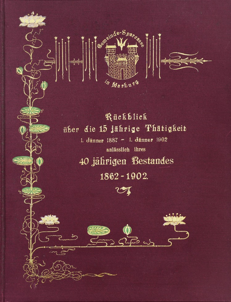 Gemeinde-Sparkasse in Marburg. Rückblick über die 15 järige Thätigkeit 1. Jänner 1887 – 1. Jänner 1902 anlässlich ihres 40 jährigen Bestandes 1862–1902 / Občinska hranilnica v Mariboru. Pregled 15-letnega delovanja od 1. januarja 1887 do 1. januarja 1902 ob 40-letnici obstoja 1862–1902. Marburg/Maribor, 1902. Trda vezava z zlato obrobo, 29,5 cm, zunanja naslovnica