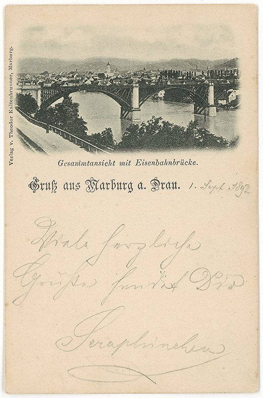 Železniški most v Mariboru. Napisa: Gruss aus Marburg a. Drau. Gesamtansicht mit Eisenbahnbrücke. / Pogled na železniški most, Pozdrav iz Maribora. Svetlotisk, založil Theodor Kaltenbruner v Mariboru, napisana 1. septembra 1892 in odposlana v pisemski ovojnici.
