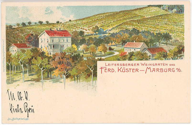 Vinograd in posestvo Ferdinanda Küsterja v Košakih. Napis: Leitersberger Weingarten des Ferd. Küster – Marburg a/D. / Lajtersberški vinograd Ferdinanda Küsterja, Maribor. Okoli 1900, kromolitografija, odposlana v pisemski ovojnici