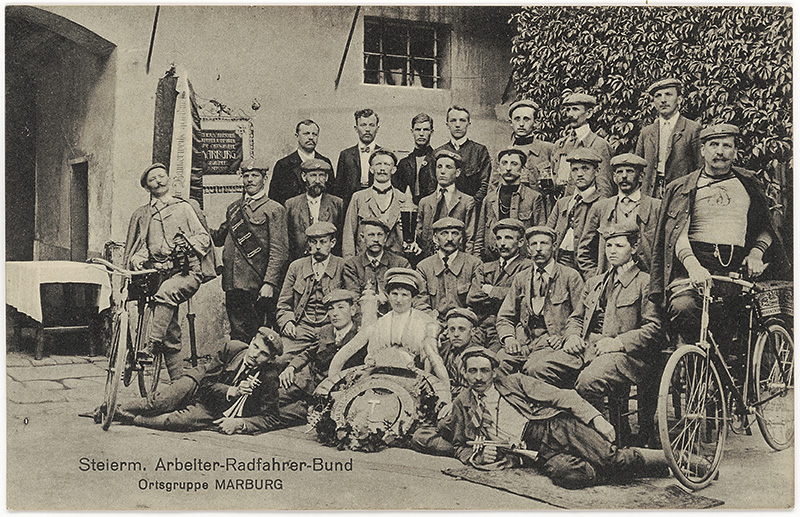 Mariborska skupina štajerske delavske kolesarske zveze. Napis: Steierm. Arbeiter-Radfahrer-Bund, Ortsgruppe Marburg. Rokopis na naslovni in sporočilni strani razglednice: Gegründet am 19. Mai 1897, Marburg Drau / Ustanovljena v Mariboru 19. maja 1897. Okoli 1910, svetlotisk, neodposlana