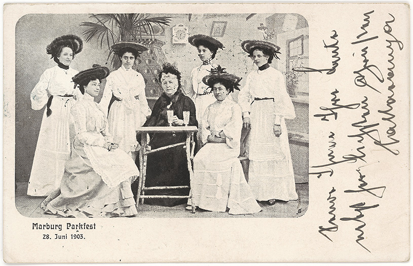 Ena izmed v seriji izdanih razglednic ob veliki družabni prireditvi v kadetnici 28. junija 1903. Napis: Marburg Parkfest, 28. Juni 1903 / Maribor, slavje v parku, 28. junija 1903. Knjigotisk, odposlana 20. oktobra 1904