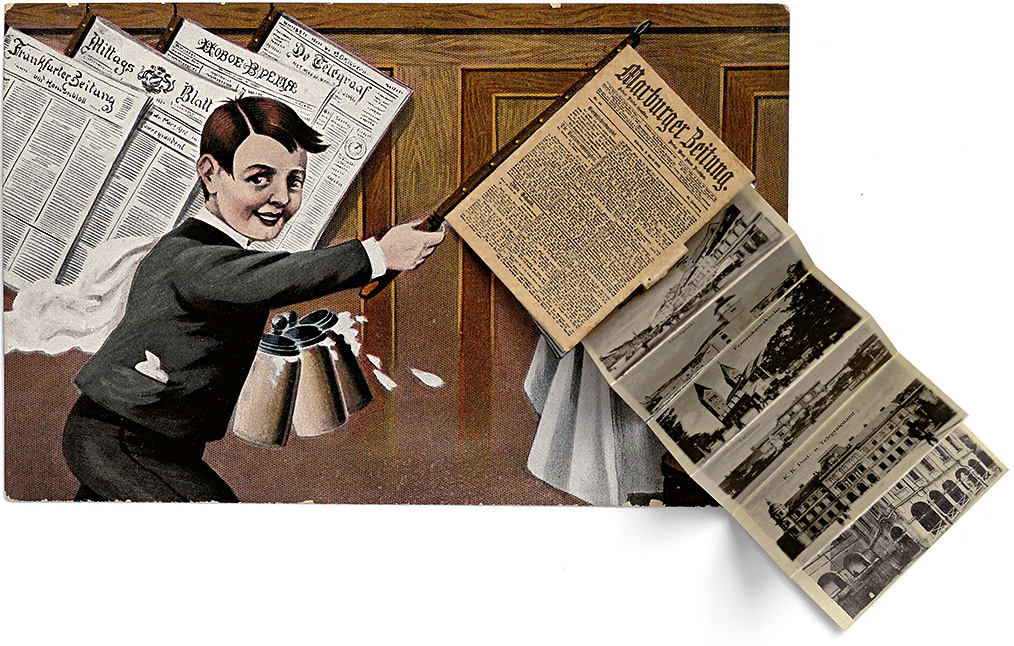 Razglednica z reklamo za časopis Marburger Zeitung. Okoli 1905, kromolitografija in svetlotisk z leporelom osmih miniaturnih slik Maribora, neodposlana