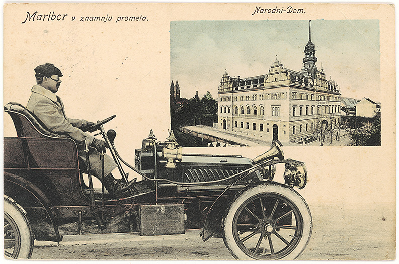 Napisa: Narodni-Dom. Maribor v znamenju prometa. 8. 2. 1906, koloriran svetlotisk, založil Anton Schlauer v Gradcu, odposlana 7. novembra 1906