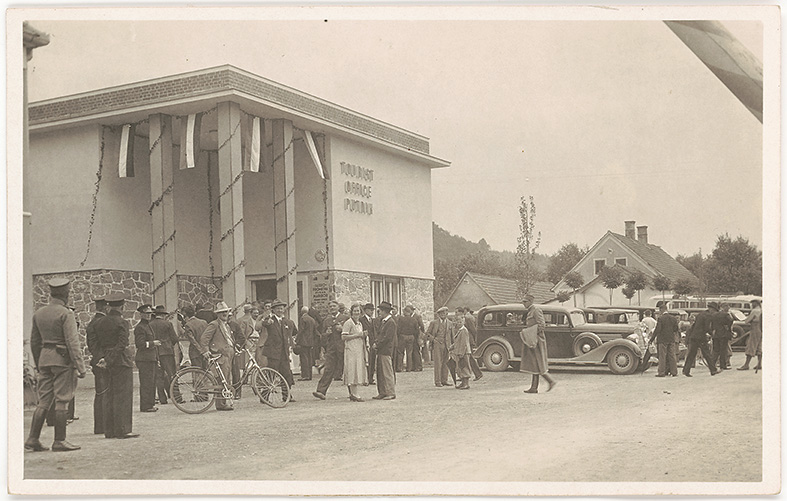 Odprtje »avtomobilskega in tujskoprometnega« paviljona Putnik mariborske Turistično-prometne zveze na mejnem prehodu v Šentilju v Slovenskih goricah. 1935, fotorazglednica, neodposlana