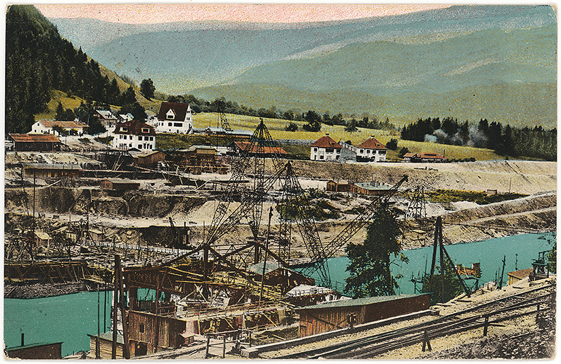 Gradnja hidroelektrarne Fala. Napis na naslovni in sporočilni strani razglednice: Faal, Bau des Elektrizitätswerkes. 1914, koloriran svetlotisk, založil Ludwig Pinter, Selnica, odposlana 11. julija 1921