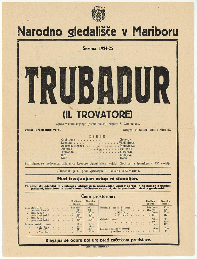 Giuseppe Verdi, Trubadur, dirigent in režiser Andro Mitrović, Narodno gledališče v Mariboru, sezona 1924/25, premiera 27. novembra 1924, lepak, 31,3 x 23,7 cm