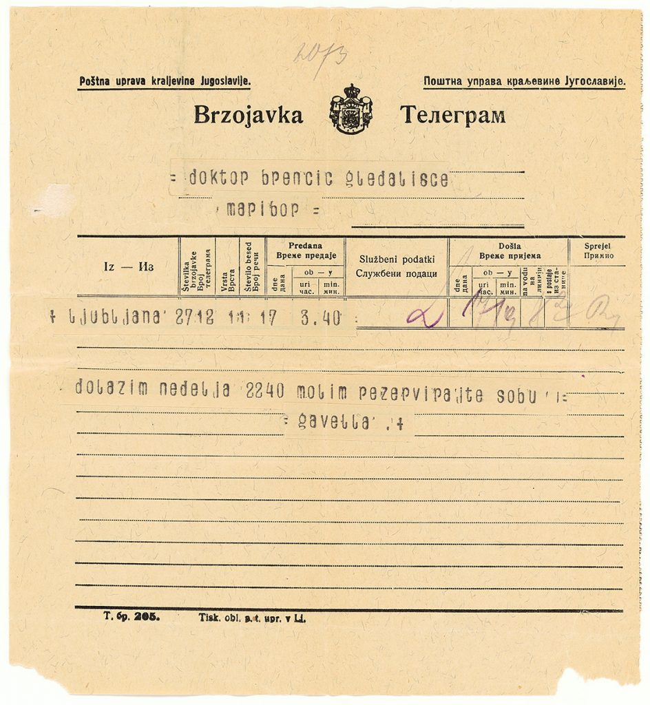 Telegram Branka Gavelle s prošnjo, naj se mu v hotelu Mariborski dvor, kjer je bival v času študija predstave, rezervira soba.