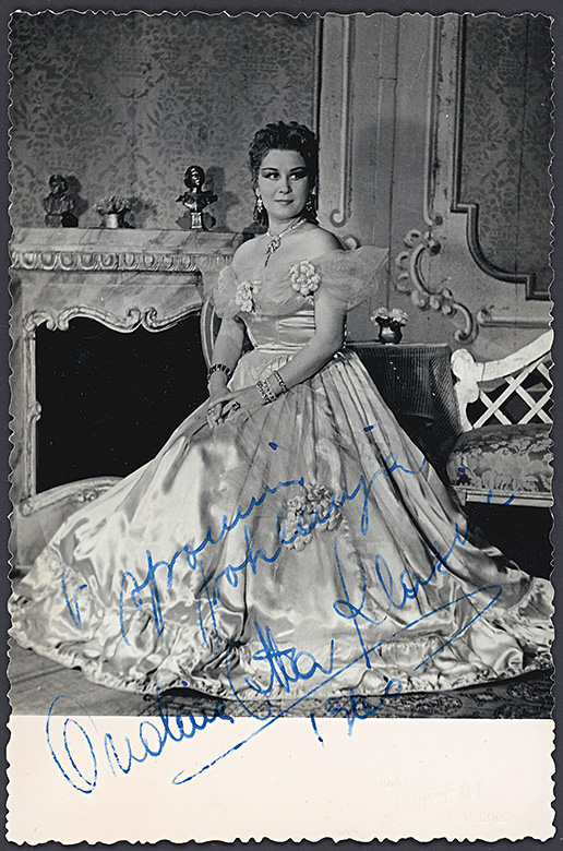 Ondina Otta Klasinc kot Violetta v operi Traviata Giuseppa Verdija, SNG Maribor, Opera, sezona 1955/56, foto Mirko Japelj, 13,3 x 8,8 cm, z avtogramom