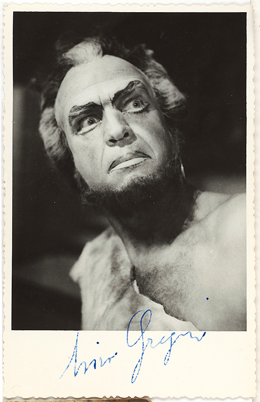 Miro Gregorin kot etiopski kralj Amonasro in Aidin oče v operi Aida Guiseppa Verdija, dirigent Jakov Cipci, režija Ciril Debevec, SNG Maribor, Opera, sezona 1957/58, premiera 5. oktobra 1957, foto Mirko Japelj, 13,7 x 8,8 cm, z avtogramom
