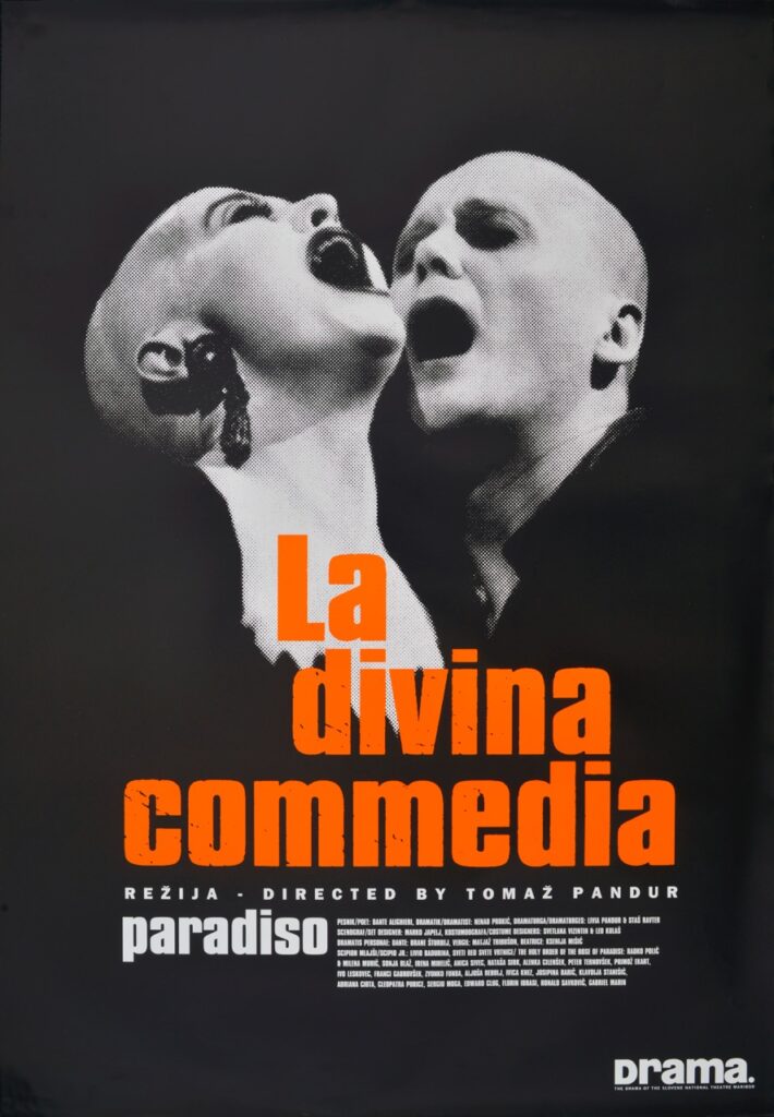 Dante Alighieri, Nenad Prokić, La divina commedia – Inferno, Purgatorio, Paradiso, režija Tomaž Pandur, sezona 1992/93, plakat, oblikovalec Željko Serdarević / Studio imitacija života, 196 x 65,5 cm. Plakat je bil natisnjen ob stoti predstavi ciklusa La Divina Commedia.