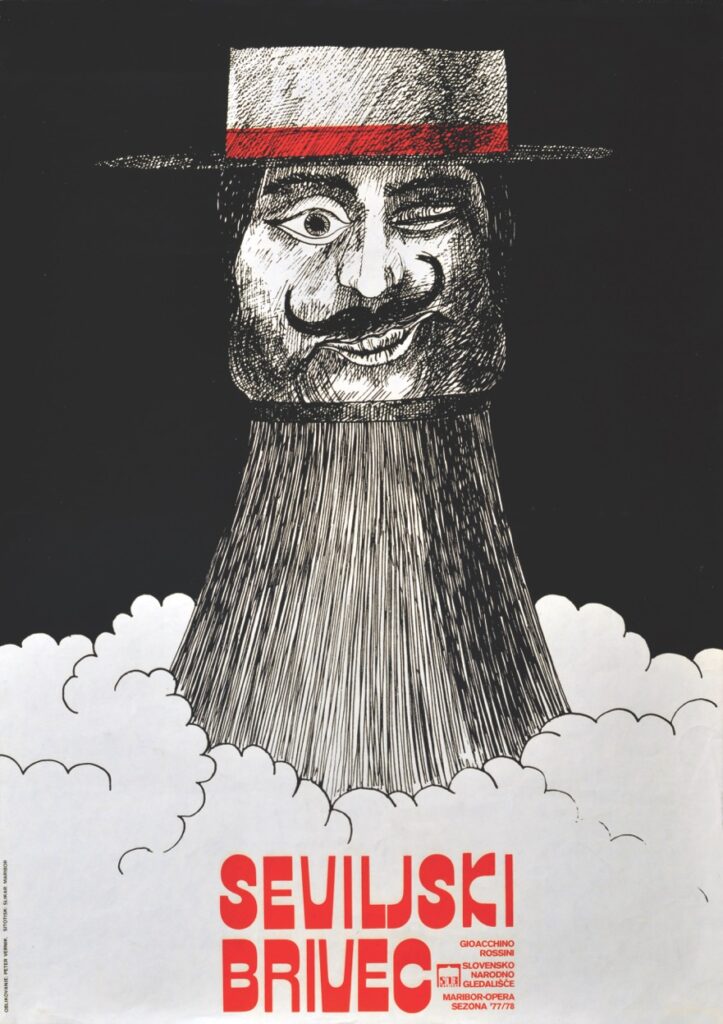 Gioachino Rossini, Seviljski brivec,dirigent Boris Švara, režija Ondina Otta Klasinc, SNG Maribor, Opera, sezona 1977/78, plakat, oblikovalec Peter Vernik, sitotisk Slikar Maribor, 67,8 x 48 cm