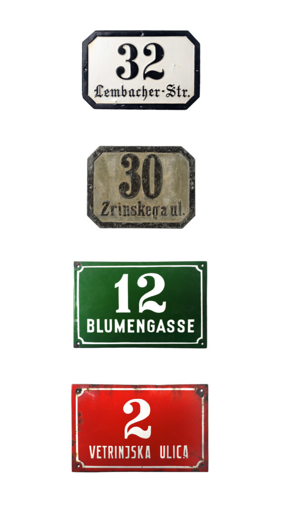 Ulične table iz časa monarhije (Lembacher-Strasse 32, sedaj Limbuška cesta), Kraljevine Jugoslavije (Zrinskega ulica 30, sedaj Zrinjskega ulica), druge svetovne vojne (Blumen-Gasse 12, sedaj Ulica heroja Šlandra) in po drugi svetovni vojni (Vetrinjska ulica 2). Emajlirana pločevina in pobarvan kositer, velikosti 25 x 17 cm, 20,8 x 15,8 cm, 26,5 x 17 cm in 26,5 x 17 cm