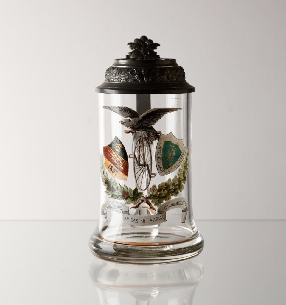 Napisi: ERINNERUNG AN DAS 10 JÄHRIGE GRÜNDUNGSFEST, v grbu: MARBURGER RADFAHRER-CLUB, 1887, v grbu:STEIERISCHER RADFAHRER GAUVERBAND, 1887 / Spomin na praznovanje ob desetletnici ustanovitve, Mariborski kolesarski klub, 1887, Štajersko kolesarsko okrožno združenje, 1887. 1897, steklo, poslikava, kositer, 0,5 l, višina 19 cm