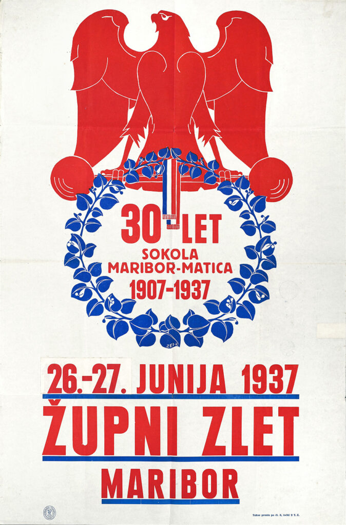 Plakat sokolskega župnega zleta v Mariboru 26. in 27. junija 1937, ob 30-letnici Sokolskega društva Maribor Matica (1907–1937); avtor Zlatko Zei, kromolitografija, Podravska tiskarna Maribor, 94,5 x 62,7 cm